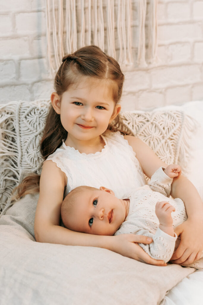 Gibt es Geschwisterkinder, dürfen diese auf den Bildern natürlich nicht fehlen. Am besten ist es, wenn die Kleidung der Geschwister farblich mit den Sets abgestimmt ist. Einige Kleider habe ich für Geschwisterkinder vor Ort. Das Outfit besprechen wir aber vorher. Während der Stillzeit mache ich gerne auch Einzelaufnahmen vom Geschwisterkind. Geschwister auf vier Pfoten sind im Studio ebenfalls herzlich Willkommen.