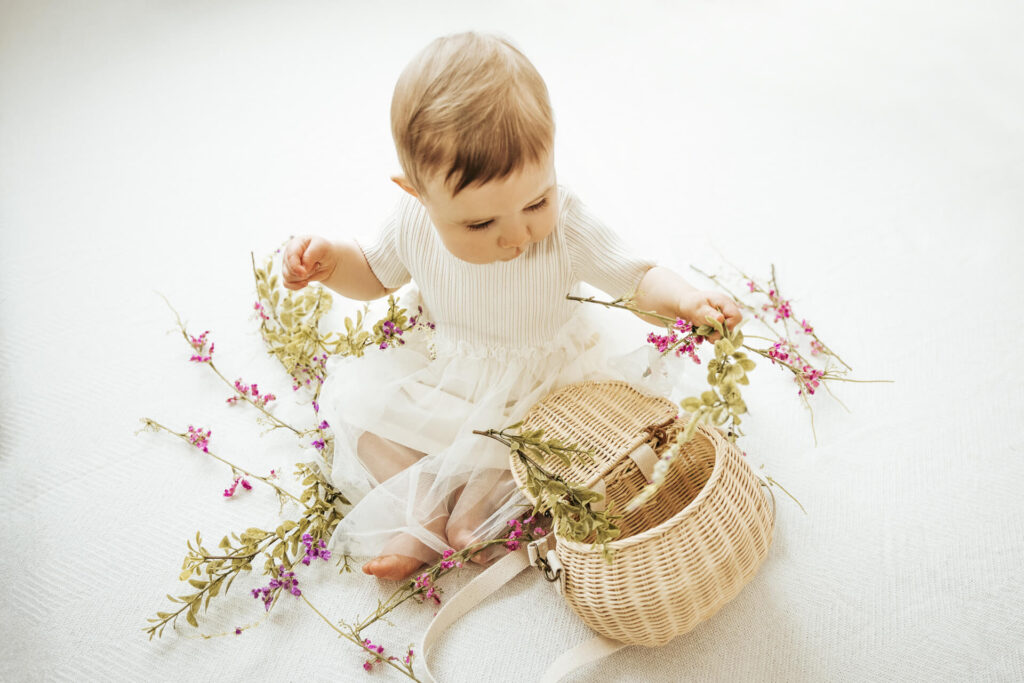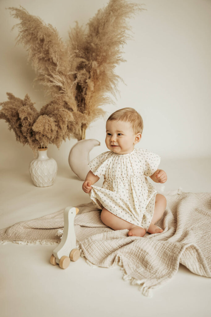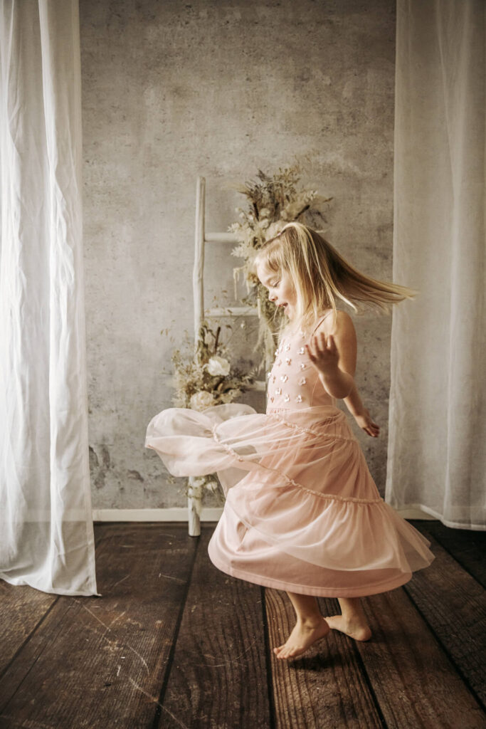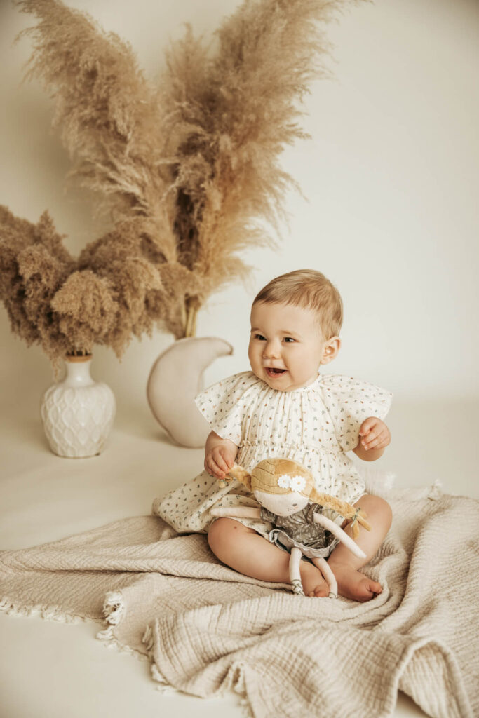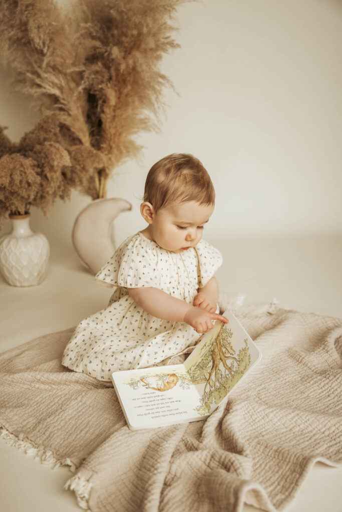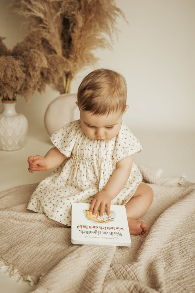 Besonders bei kleineren Mäusen ist eine Auswahl an Spielsachen sehr hilfreich, besonders, wenn es optisch auch ins Bild passt. Ob mit einer Puppe oder auch mal mit einem Buch, so können wir die kleinen schön beschäftigen ohne, dass sie das Shooting als solches bemerken. Wichtig ist immer den Druck raus zu nehmen. Die Kinder sollen Spaß haben. So lachen sie von ganz alleine und machen einfach ihr Ding. Perfekt, um ganz authentische Erinnerungen für Euch zu schaffen. Die ungestellten Bilder sind am Ende doch immer die Schönsten.