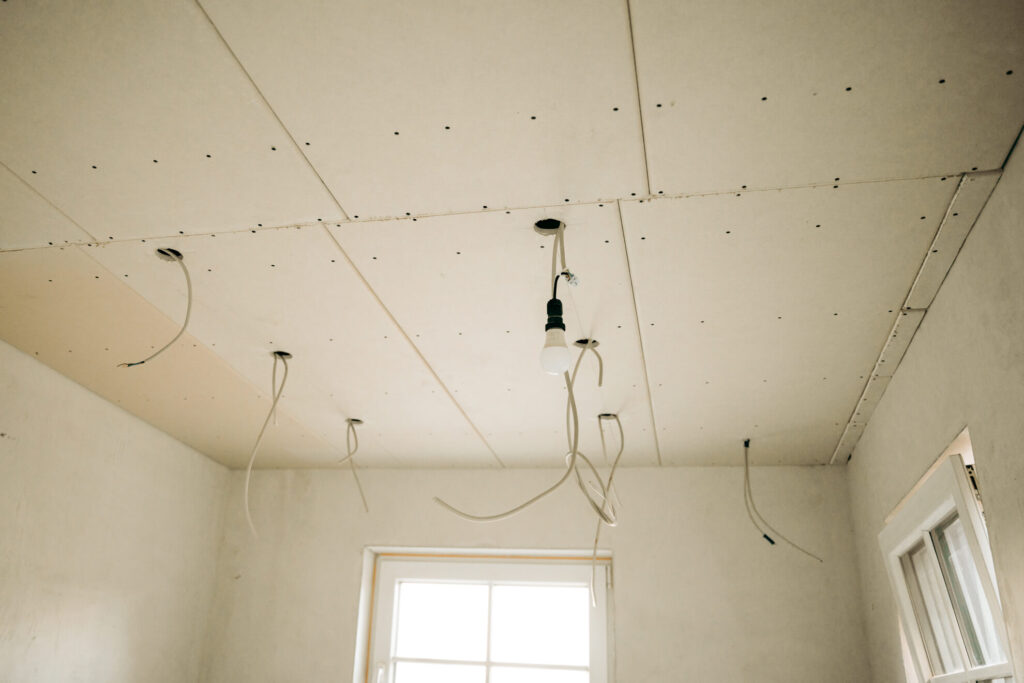 Im September ging es endlich weiter. Die Decken sind fast fertig abgehängt. Bis auf eine Lampe sind alle da und warten darauf, dass die Decken fertig gestrichen sind.
