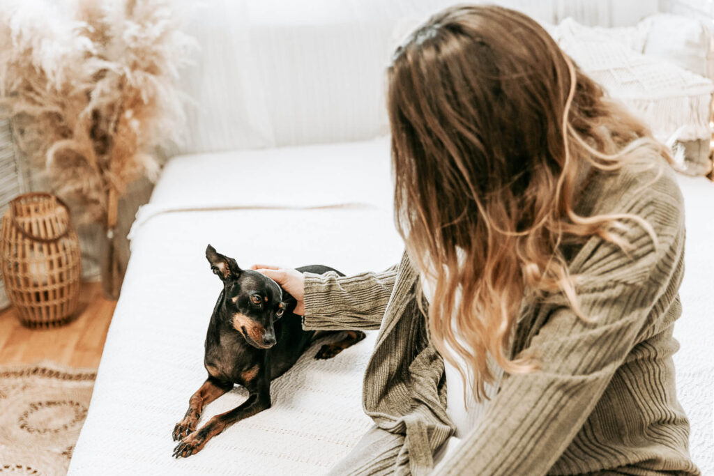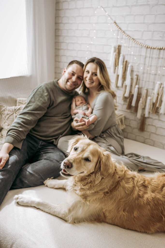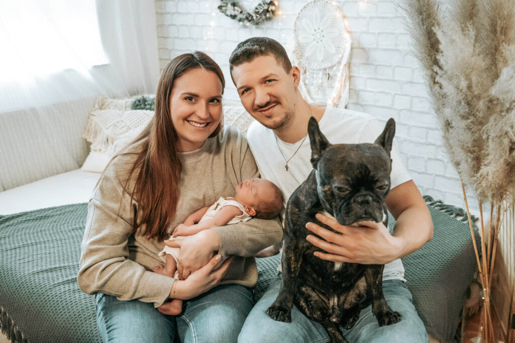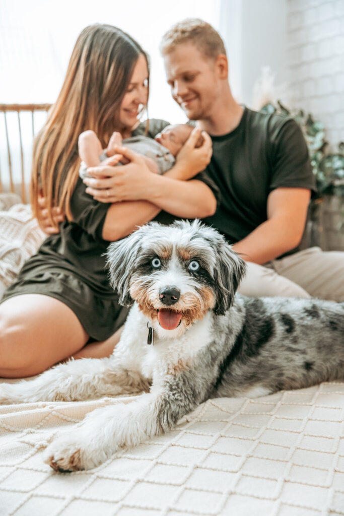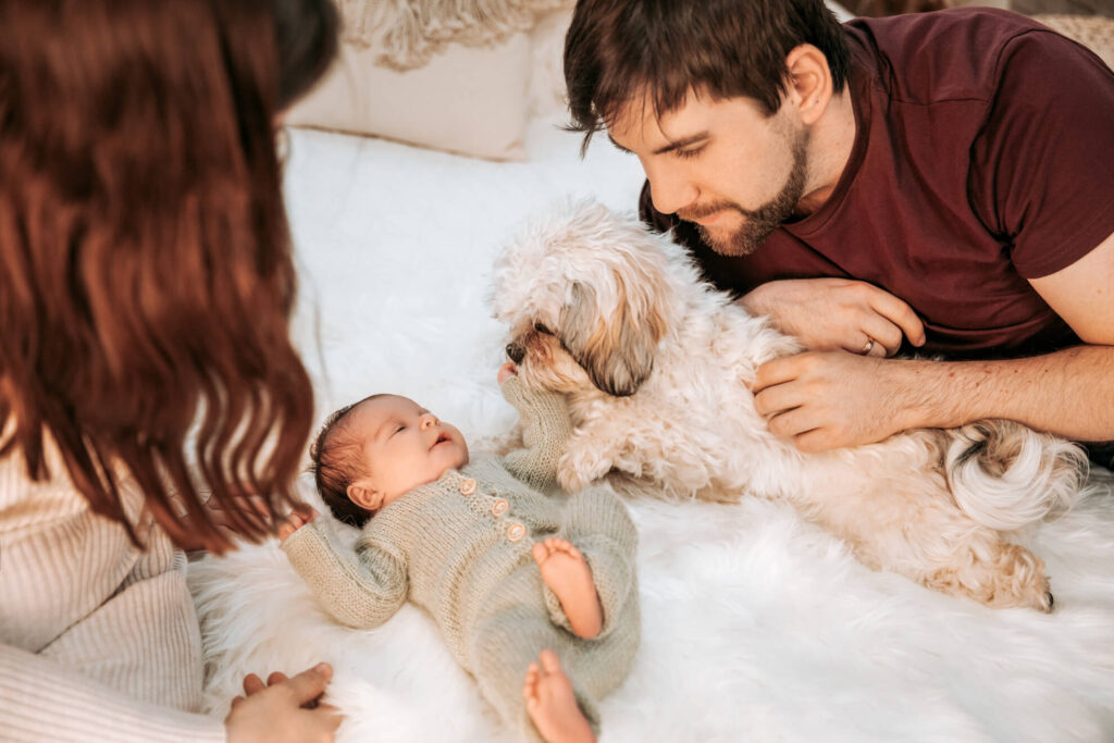 Auch bei den Familienbildern kommt Euer Hund nicht zu kurz. Im Studio darf er gerne mit aufs Bett. Das wird danach selbstverständlich frisch bezogen.