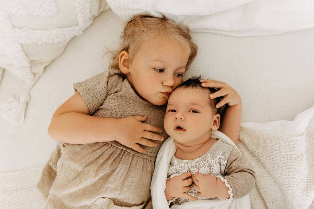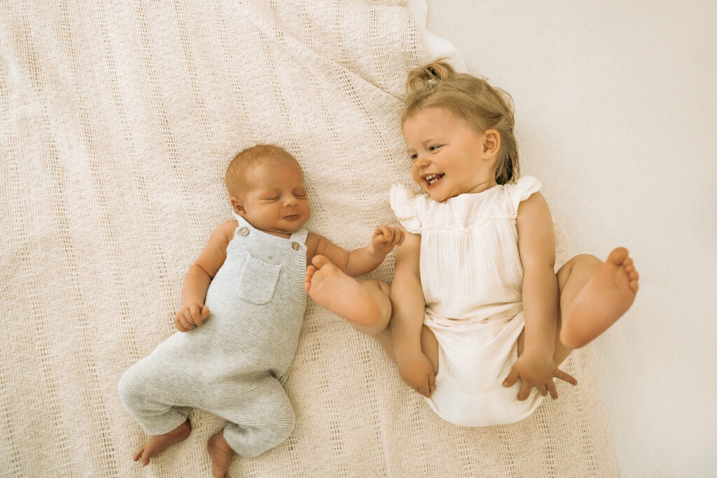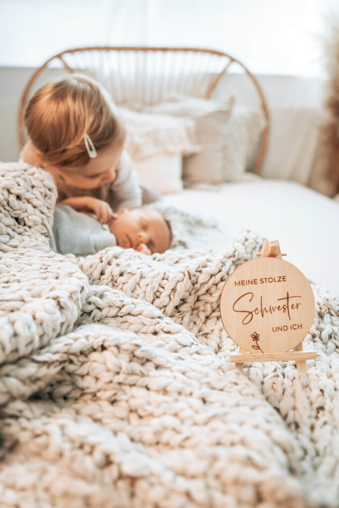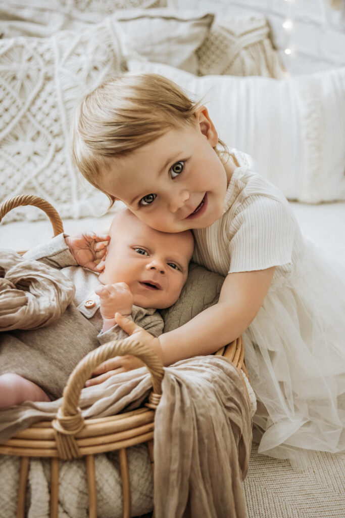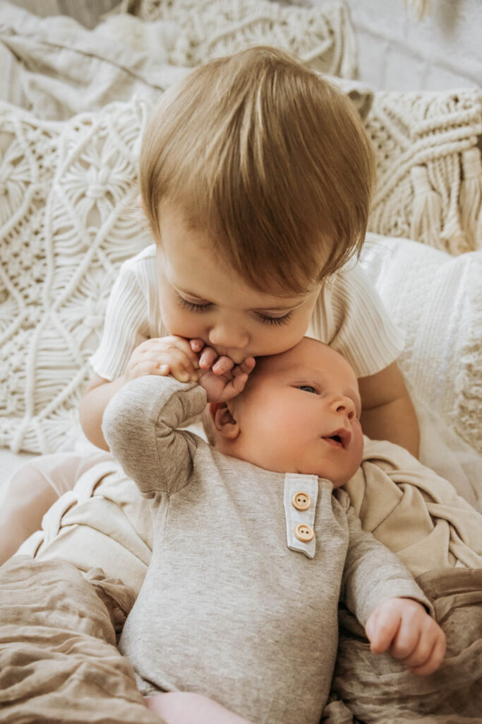 Es könnte zum Beispiel die Aufgabe bekommen, dem Baby ein Kuscheltier zu bringen oder ihm liebevoll über den Kopf zu streicheln. Dadurch fühlt sich das ältere Kind eingebunden und kann aktiv am Fotoshooting teilnehmen. Hier habe ich besonders gute Erfahrungen gemacht. Es entstehen besondere, ungestellte Momente, die ich festhalten kann.