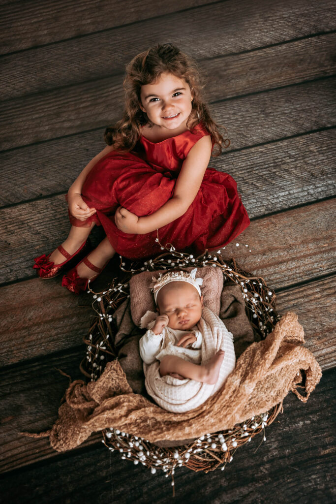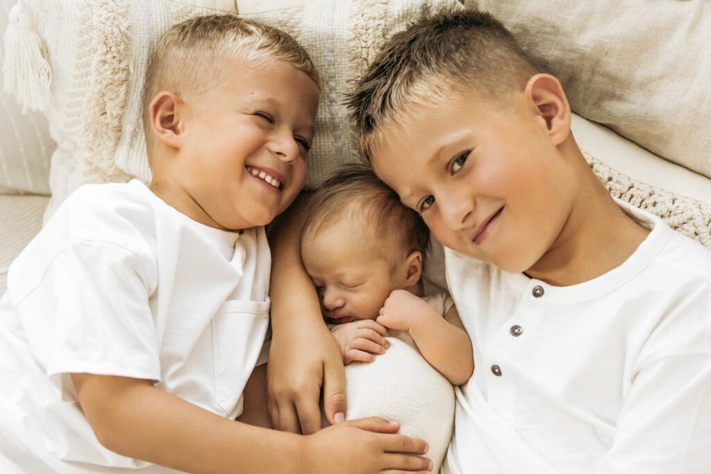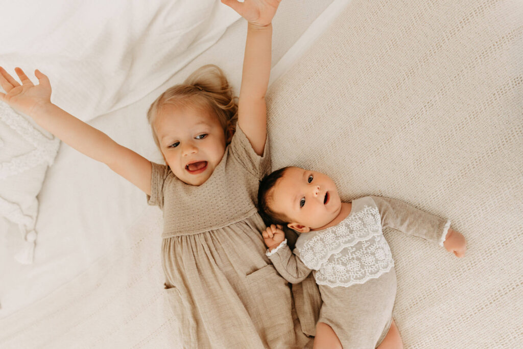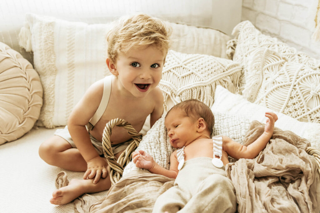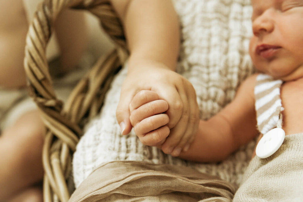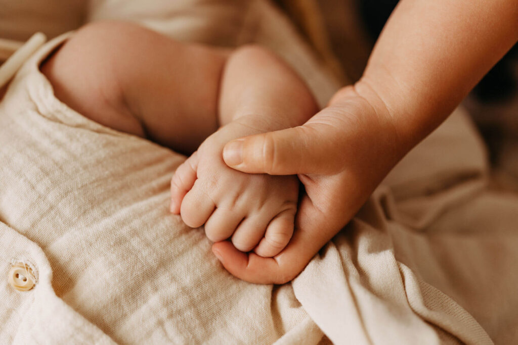 Es könnte zum Beispiel die Aufgabe bekommen, dem Baby ein Kuscheltier zu bringen oder ihm liebevoll über den Kopf zu streicheln. Dadurch fühlt sich das ältere Kind eingebunden und kann aktiv am Fotoshooting teilnehmen. Hier habe ich besonders gute Erfahrungen gemacht. Es entstehen besondere, ungestellte Momente, die ich festhalten kann.